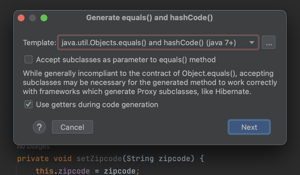return Objects.equals(city, address.city) && Objects.equals(street, address.street) && Objects.equals(zipcode, address.zipcode);