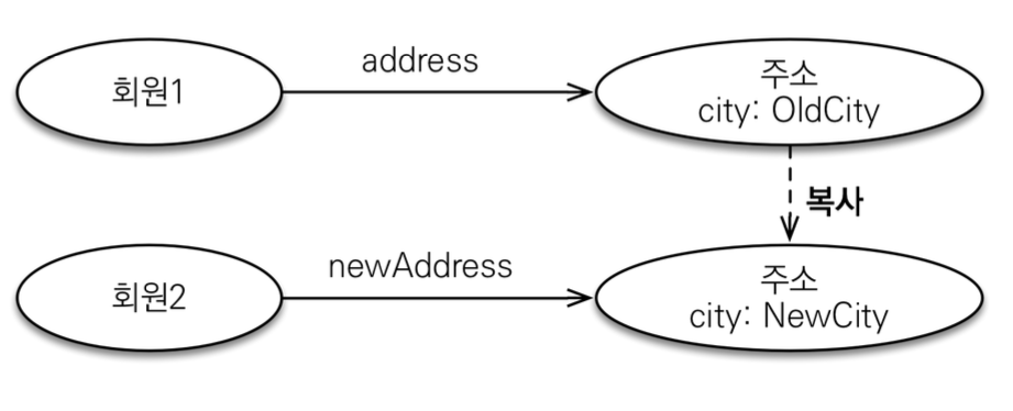 - 임베디드 타입 같은 값 타입을 여러 엔티티에서 공유하면 위험하다.