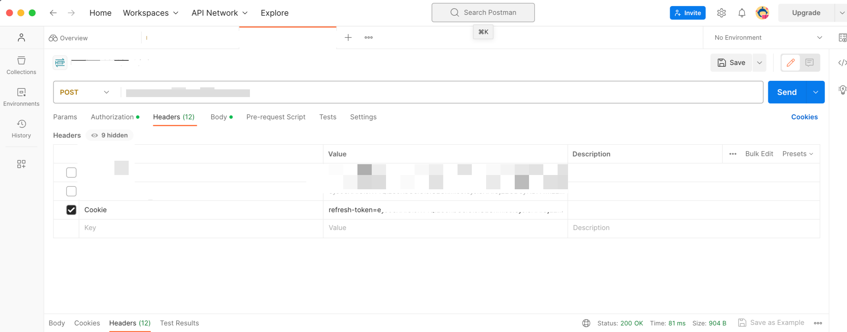 그러나.. Postman에서 API를 호출할때 @Cookievalue를 받으려면 Headers에 쿠키를 따로 설정해줘야한다.