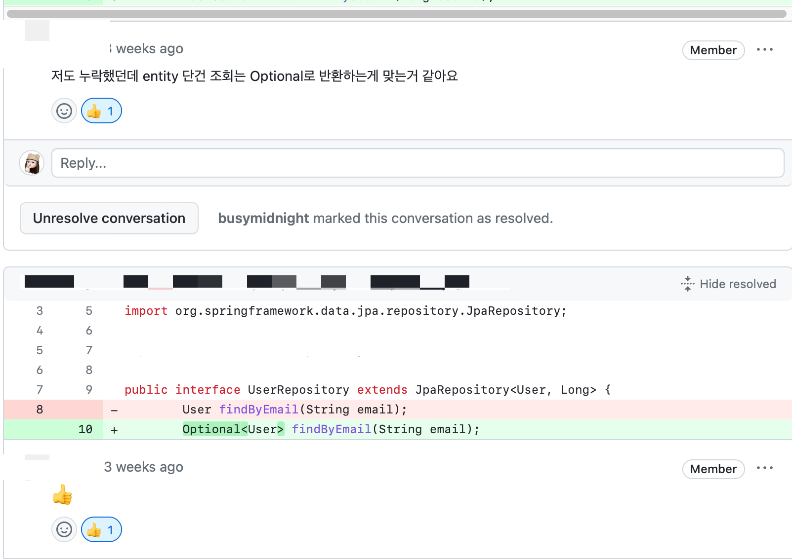 개발자들이 가장 많이 마주치는 에러가 아닐까 싶다. (만나기. 싫어요. 제발). NPE는 Null 반환 자체도 문제지만 추적할 수 없어 오류 핸들링이 더 어렵다는 극악무도한 점이 있다. 아무튼 내 케이스에서 원인은 없는 User 엔티티를 반환하려다 보니 발생한 에러였고, 이를 좀 더 쾌적하게 핸들링 하기 위해 Optional을 처음 사용하게 되었다. 기존 다른 코드에도 엔티티 단건 조회는 전부 엔티티를 반환하고 있었기에 이를 계기로 안전하게 Optional로 한번 감싸서 반환하게 되었다.