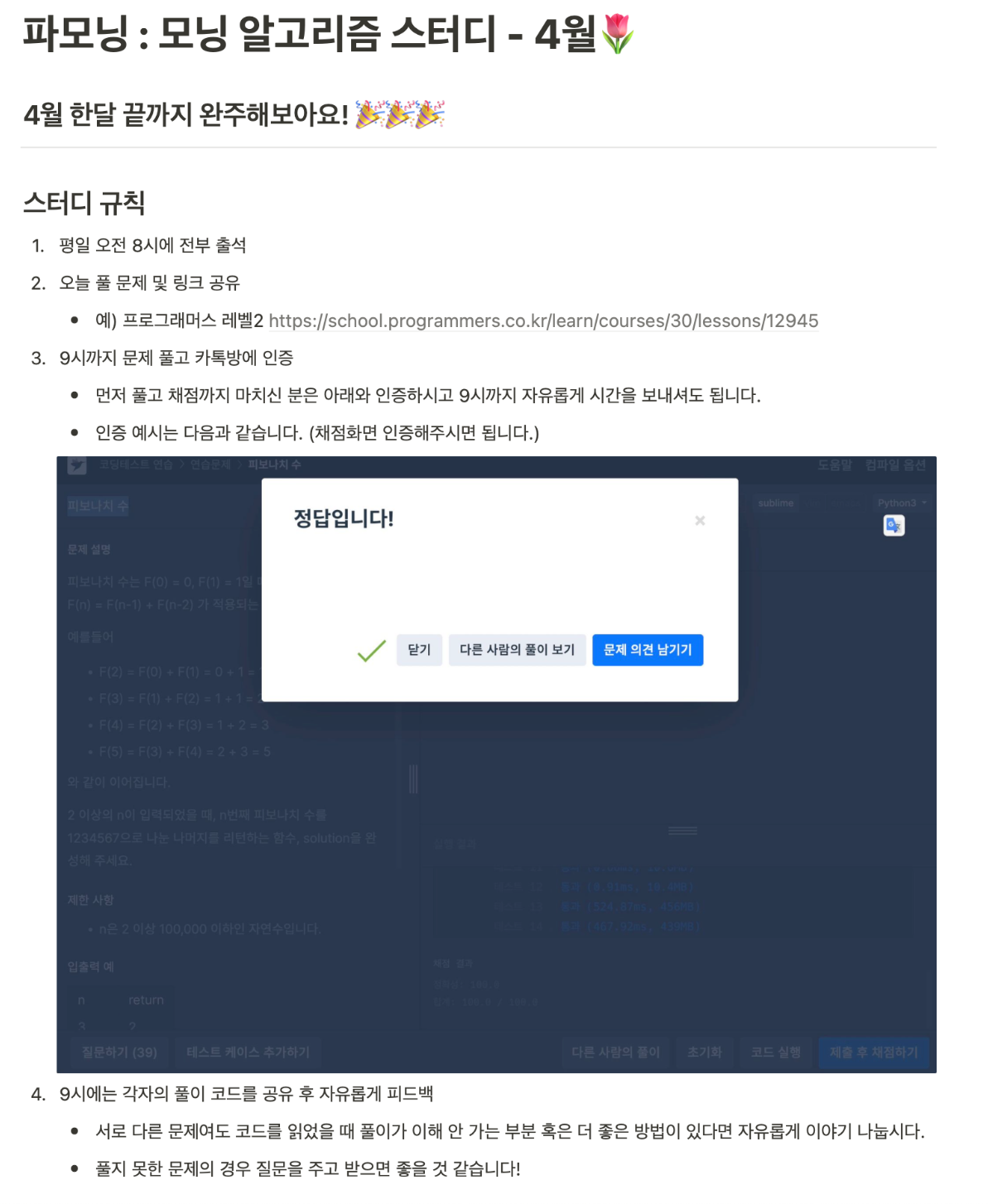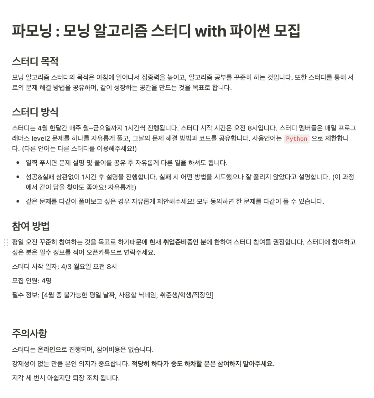 해서 뚝딱 스터디를 기획하고 인프런에서 모집하여 4명의 파이썬 모닝 알고리즘 스터디를 시작했다.