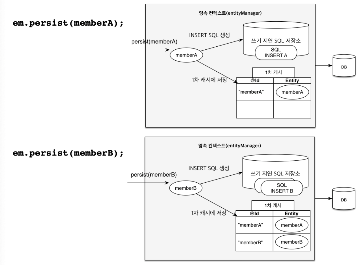 - 영속(managed) : 영속성 컨텍스트에 관리되는 상태