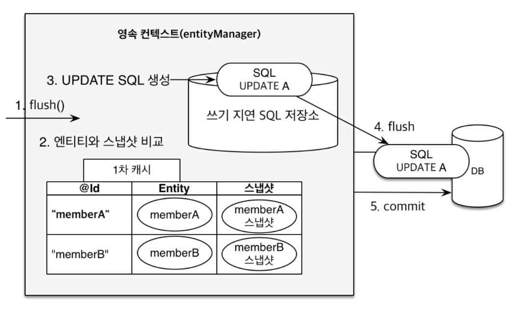 스냅샷과 엔티티를 비교하여 변경된 부분이 있으면 감지하여 자동 반영한다.